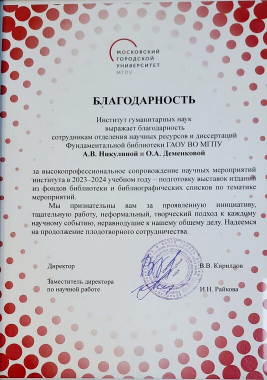 Заместитель директора ИГН по научной работе Ирина Николаевна Райкова вручила сотрудникам Фундаментальной библиотеки благодарственные письма от ИГН за «высокопрофессиональное сопровождение научных мероприятий института в 2023—2024 учебном году — подготовку выставок изданий из фондов библиотеки и библиографических списков по тематике мероприятий».