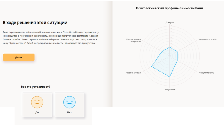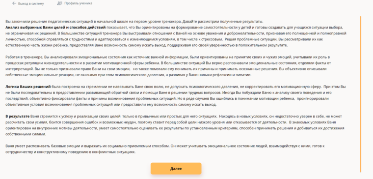 Такой эффективности невозможно добиться при проведении обучения в традиционном формате, так как организовать на лекциях, тренингах, курсах персональную обратную связь и в полной мере использовать компетентностный подход не представляется возможным, в силу ограниченности времени занятия. Организационная и экономическая эффективность тренажера обусловлена индивидуальным и дистанционным характером обучения. Из 24 часов, выделенных на прохождение тренажера, только 4 часа отводятся на теорию, остальное время занимает непосредственная практика работы с виртуальным учеником. Даже при прохождении стажировок студентам педагогических вузов не удается провести 20 «пробных» уроков. Отдельно стоит упомянуть, что каждый из таких «уроков» тренажера завершается предоставлением индивидуальной, адресной обратной связи.