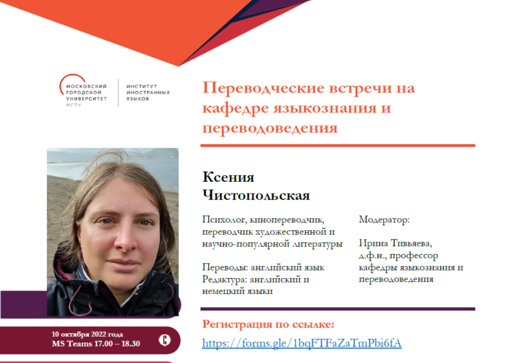 Встреча состоится в понедельник 10.10.2022 в 17.00 на платформе MS Teams. Модератор – д.ф.н., профессор кафедры языкознания и переводоведения, заместитель директора ИИЯ МГПУ Ирина Тивьяева.
