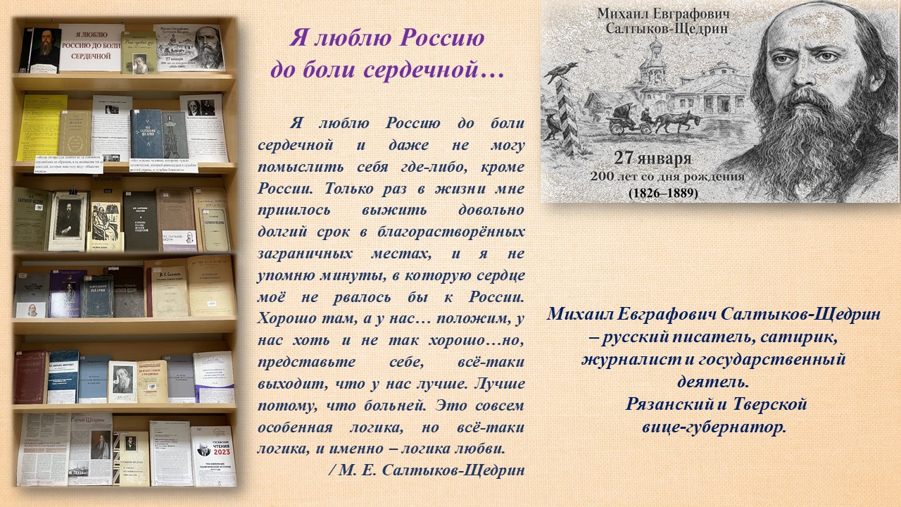 27 января 2026 года исполняется 200 лет (1826−1889) со дня рождения русского писателя, сатирика, журналиста и государственного деятеля Михаила Евграфовича Салтыкова-Щедрина. Автора произведений «История одного города», «Господа Головлёвы», «Пошехонская старина», «Сказки для детей изрядного возраста» и многих других.