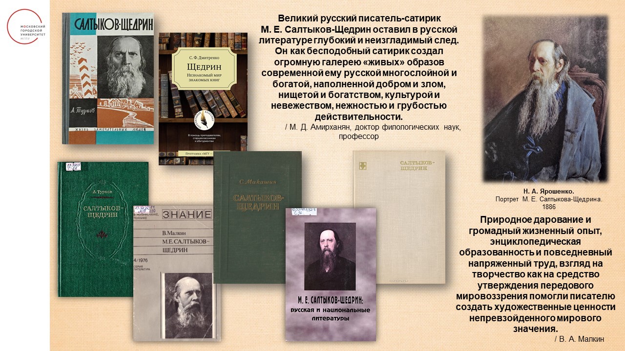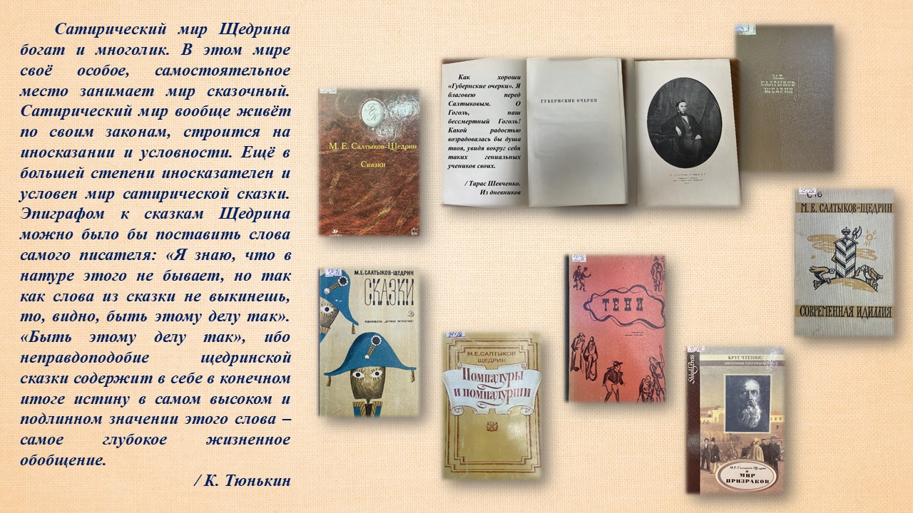 Видеоматериалы и презентацииВо исполнение Указа Президента Российской Федерации от 10 марта 2025 г. «О праздновании 200-летия со дня рождения М.Е. Салтыкова-Щедрина» в отделениях обслуживания Фундаментальной библиотеки подготовлен план мероприятий к юбилею великого русского писателя.