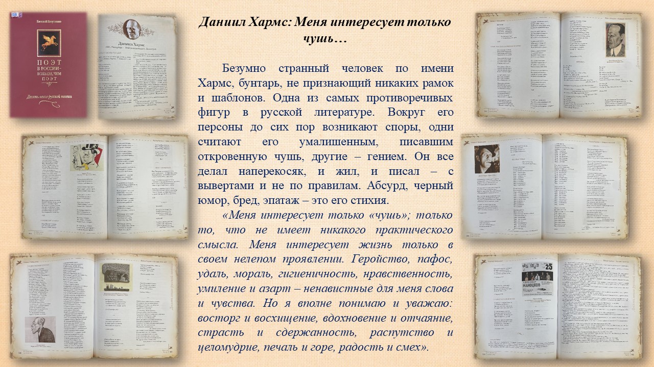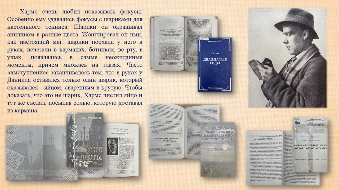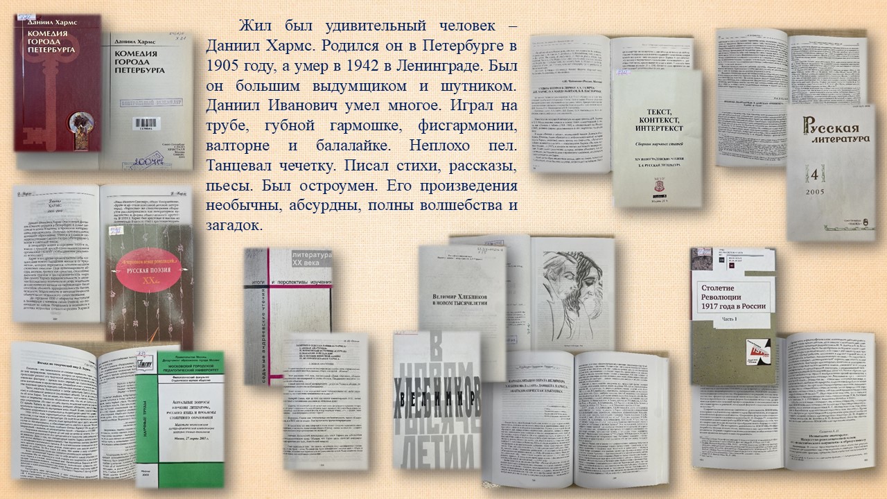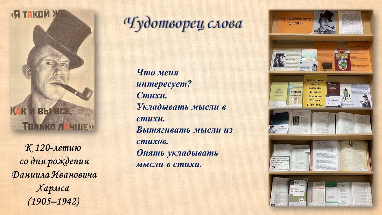 «Меня интересует только „чушь“; только то, что не имеет никакого практического смысла. Меня интересует жизнь только в своем нелепом проявлении…», — писал Даниил Хармс.30 декабря исполняется 120 лет (1905−1942) со дня рождения Даниила Ивановича Хармса. Русский и советский, поэт и драматург. Основатель объединения деятелей культуры-новаторов «ОБЭРИУ». Сотрудниками справочно-библиографического отделения Фундаментальной библиотеки подготовлена и представлена книжная выставка «Чудотворец слова».