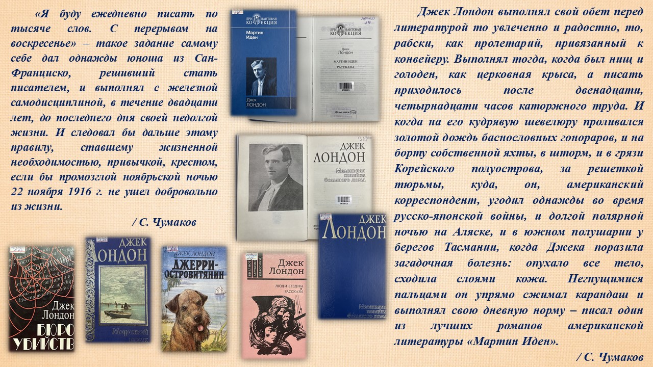 12 января 2026 года исполнилось 150 лет со дня рождения Джека Лондона. Автора книг — «Мартин Иден», «Белый Клык», «Маленькая хозяйка большого дома», «Сердца трех» и многих других. Джон Гриффит Чейни (именно таким было настоящее имя будущего популярного писателя). Сотрудниками справочно-библиографического отделения Фундаментальной библиотеки подготовлена и представлена книжная выставка «Его жизнь отражала его время».