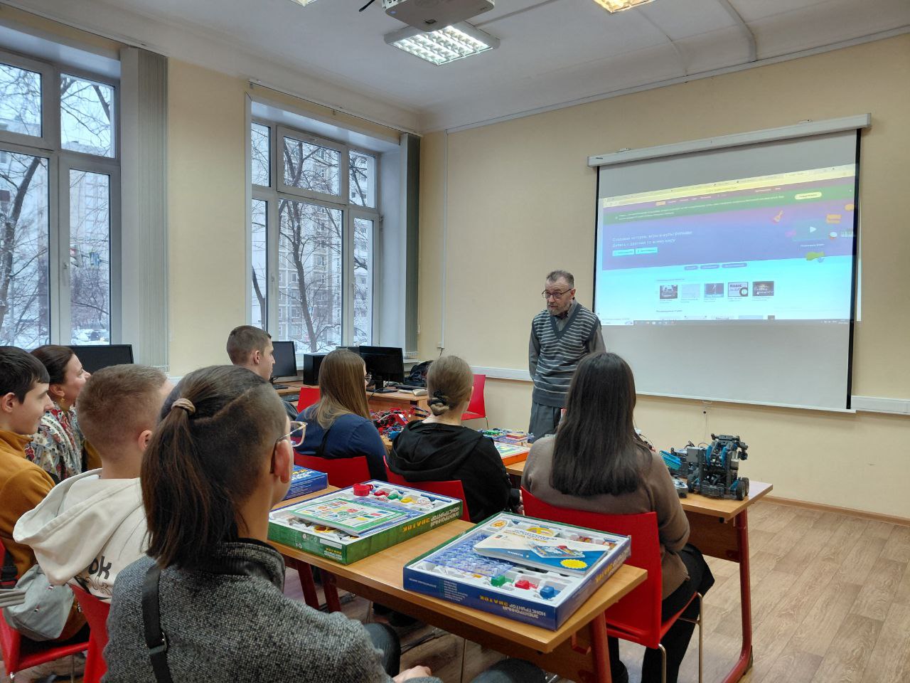 На робототехнике школьники познакомились с коллекцией образовательных конструкторов и наборов, которые используются в учебном процессе, а затем сами собрали простейшую схему.