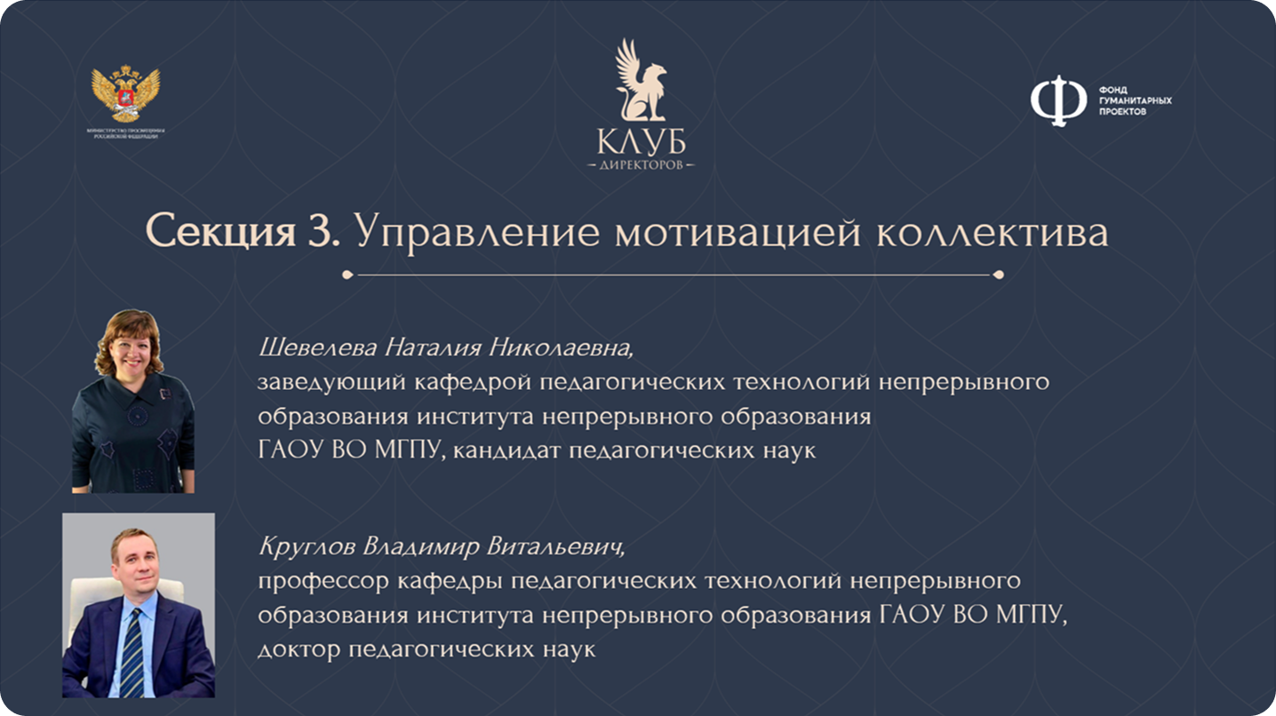 В рамках конференции заведующий кафедрой педагогических технологий непрерывного образования института непрерывного образования МГПУ Наталия Шевелёва и профессор кафедры Владимир Круглов выступили в качестве модераторов секции «Управление мотивацией коллектива».