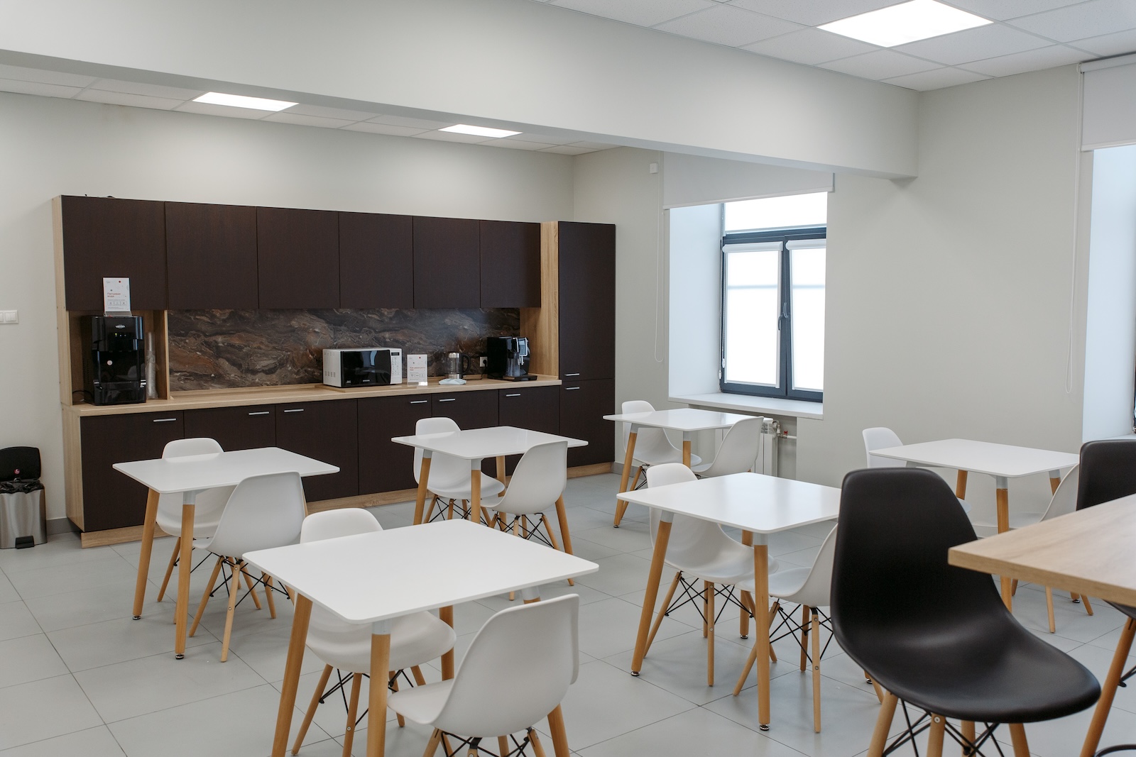 - На кухне можно перекусить и отдохнуть. Для удобства гостей зона оборудована холодильником, кулером с горячей водой, микроволновкой и кофе-машиной.
