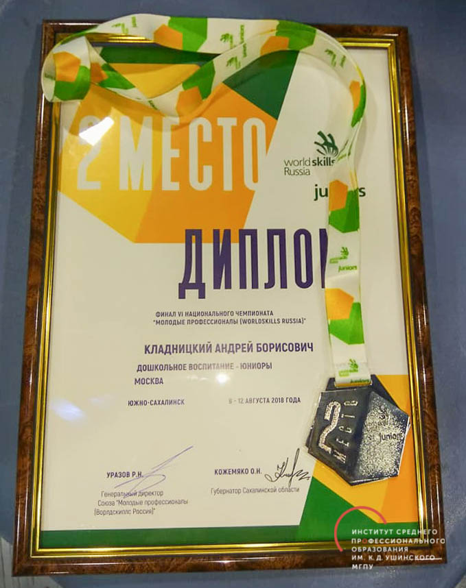 Заслуженное 2 место в финале Юниоров по компетенции «Дошкольное воспитание» занял Андрей Кладницкий, ученик 9 класса ГБОУ СОШ № 1357, участник программы подготовки Юниоров в Skills-центре при Институте СПО имени К.Д. Ушинского. Поздравляем!