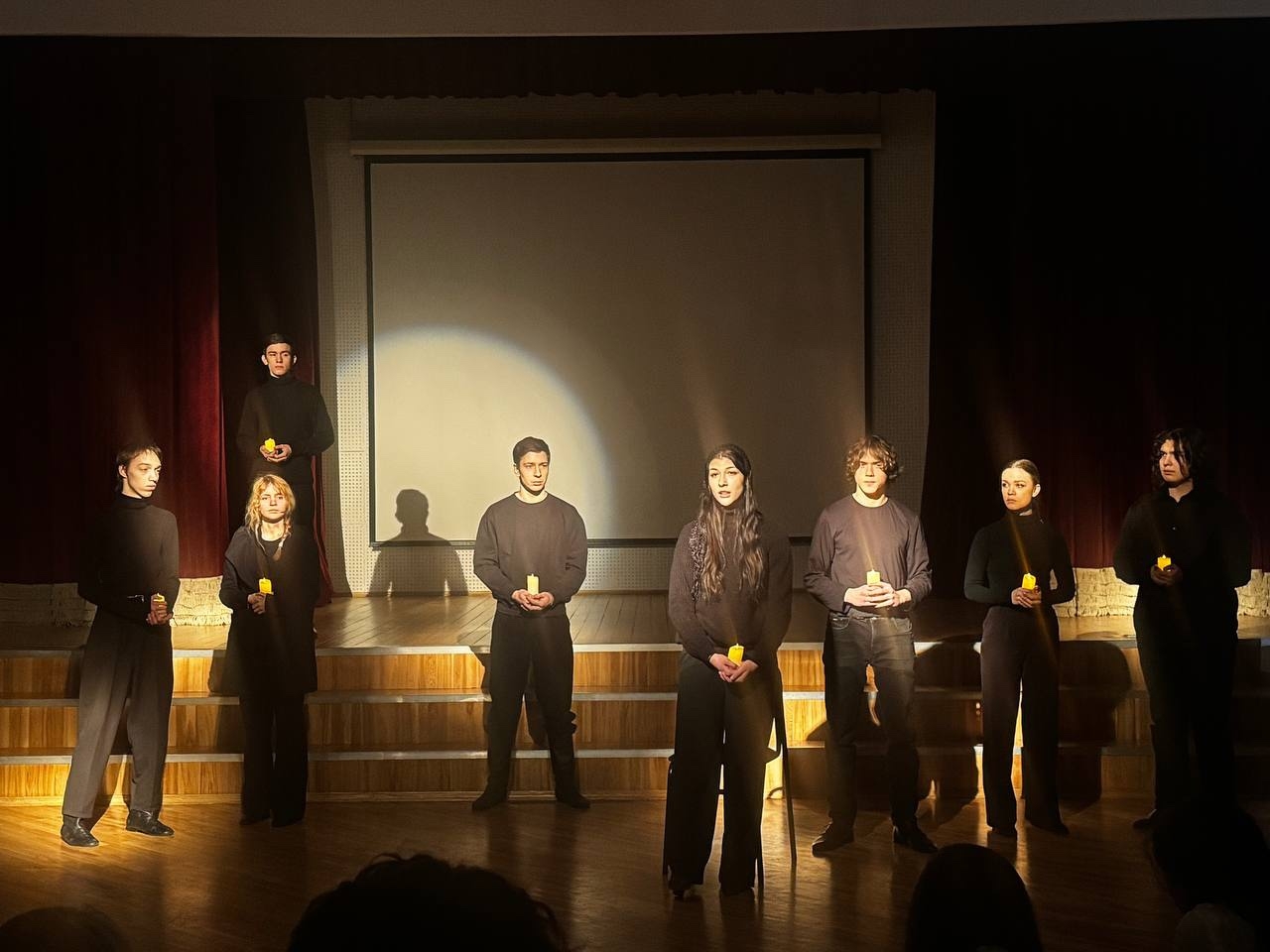 Спектакль прошёл в иммерсивном формате. В тёмном зале зрителей рассадили необычно — ближе к актёрам, чтобы создать эффект полного погружения. Ребята не просто смотрели, а проживали каждую минуту вместе с героями. В финале на экране появлялись архивные фотографии блокадного Ленинграда — словно подтверждение историй, которые порой кажутся невероятными.