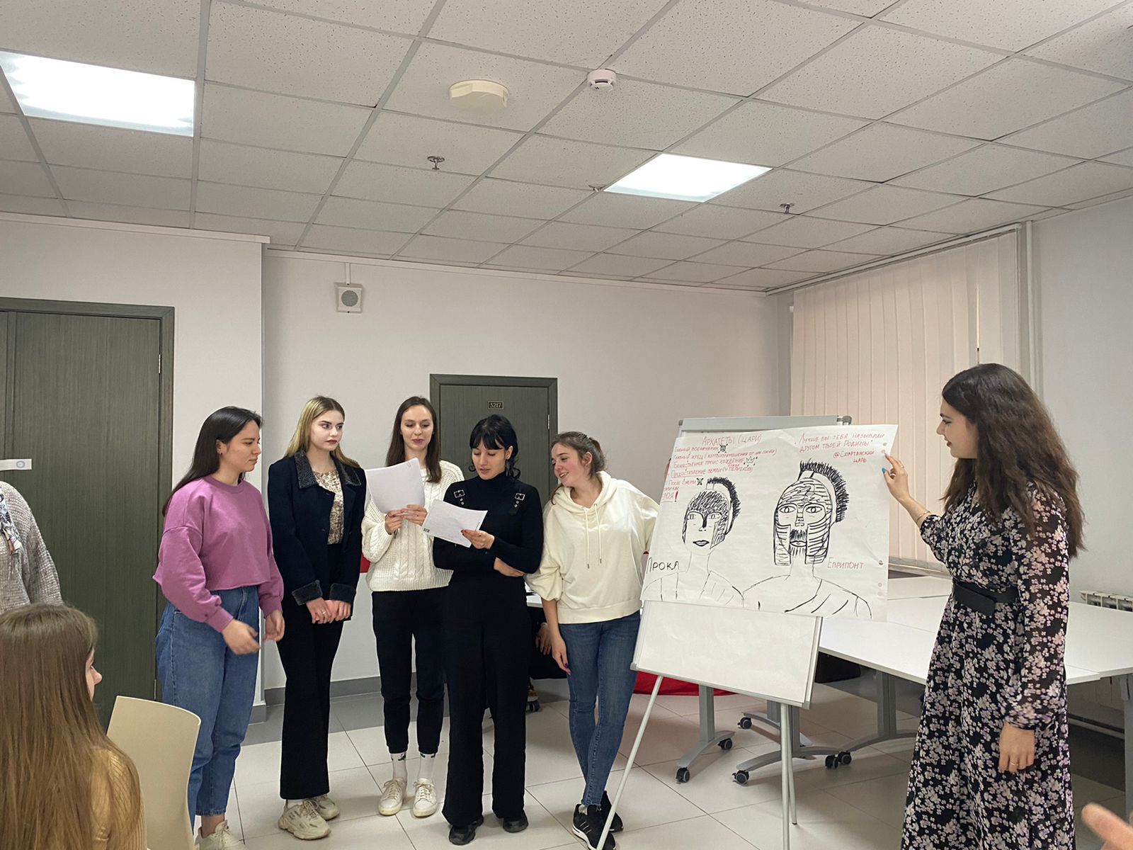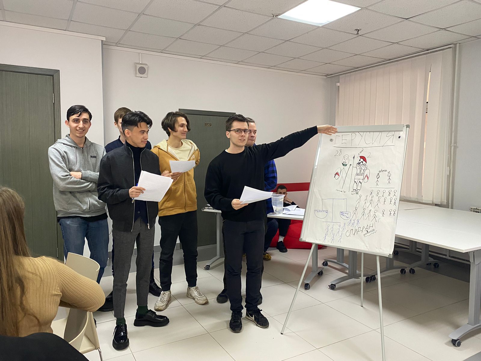Студентам были предложены разнообразные задания, где каждый смог проявить себя в той сфере, которая нравится. Это не только работа с историческими источниками древних авторов, их анализ, но и интересное творческое задание. В этой игре политические институты: герусия, апелла, эфоры, архагеты посредством жеребьевки были распределены между ребятами, и каждый участник из четырёх команд, стремился приложить все усилия для достижения победы в соревновании. Для скуки не было места! Помимо анализа материала, необходимо было применить свои знания, чтобы дополнить информацию из источника и представить графически политический институт древней Спарты.