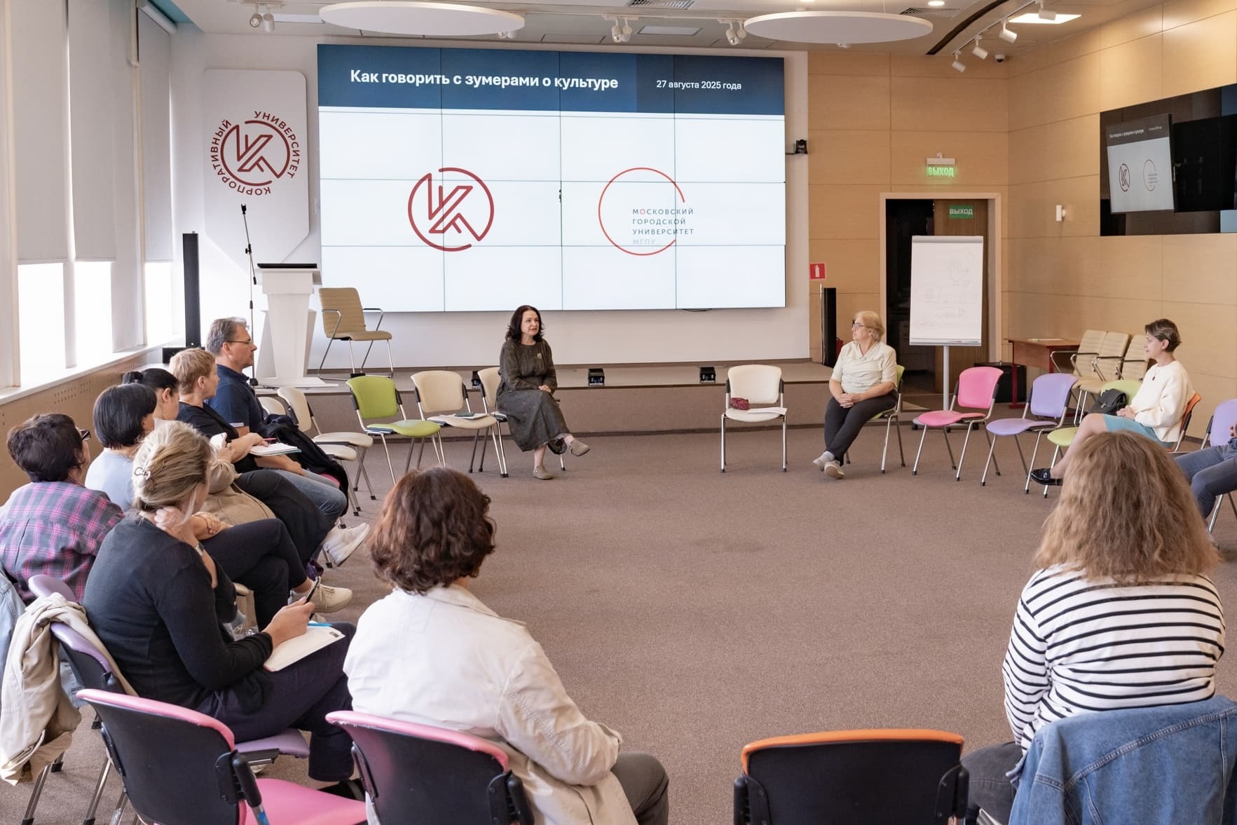 27 августа 2025 года сотрудники лаборатории социокультурных образовательных практик НИИ урбанистики и глобального образования МГПУ Екатерина Асонова и Александра Никитина встретились с педагогами и библиотекарями, чтобы обсудить, как говорить с поколением Z о культуре. Встреча была организована ГАОУ ДПО «Корпоративный университет».