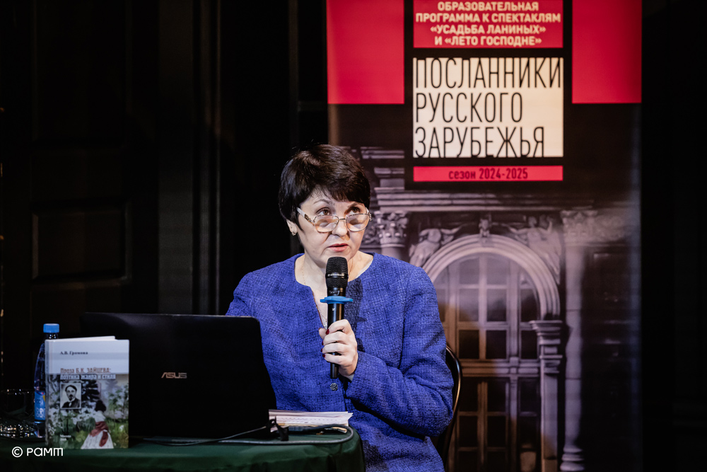 Лекция профессора департамента филологии института гуманитарных наук Московского городского педагогического университета Аллы Витальевны Громовой о творчестве Бориса Зайцева стала частью программы «Посланники Русского Зарубежья» в образовательном проекте Российского академического молодёжного театра «Театр+».