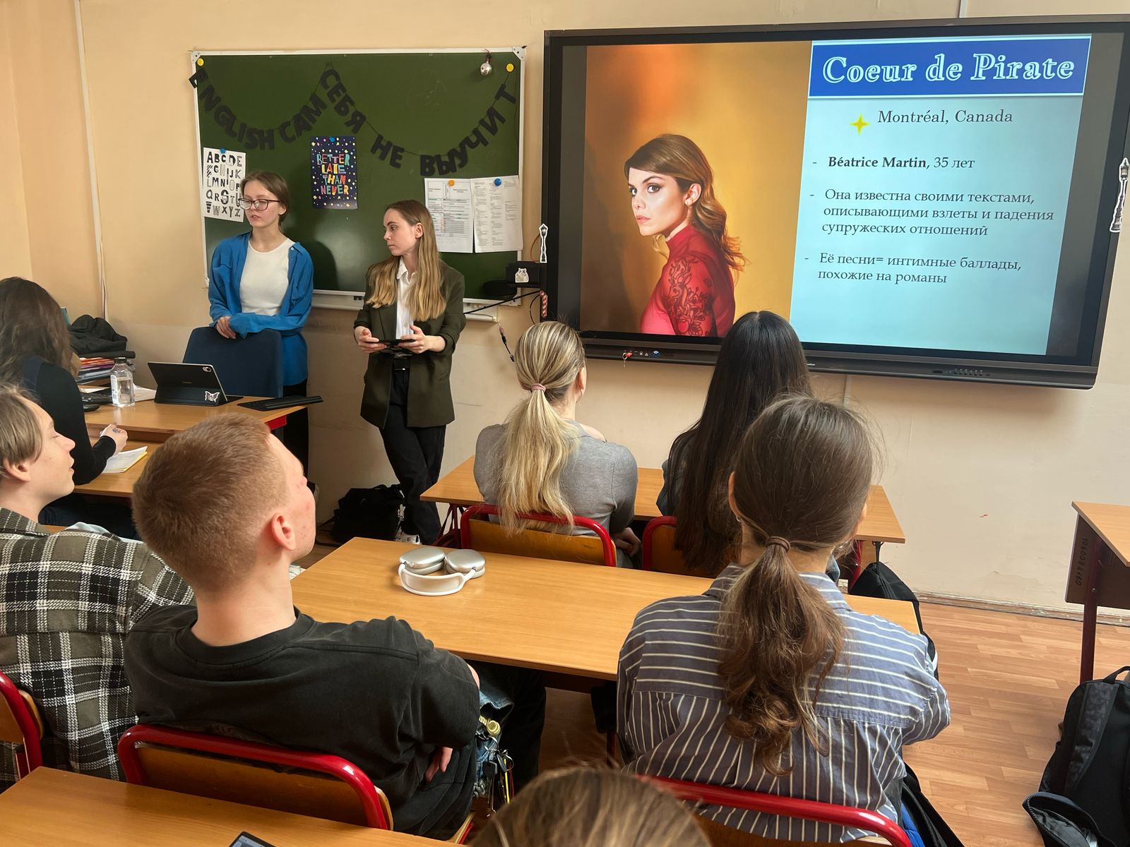 17 апреля студенты 3 курса кафедры романских языков и лингводидактики Абдрахманова Елизавета и Огородова Алина провели увлекательную лекцию для учеников 9 класса школы № 1284. Студенты рассказывали про французскую музыку, представили современных исполнителей, популярные жанры и трендовые песни на французском языке. Музыкальная тематика всегда вызывает особый интерес у юного поколения, поэтому лекция получила большой отклик: ученики активно вовлекались в беседу, задавали вопросы, делились впечатлениями и скачивали новые песни.