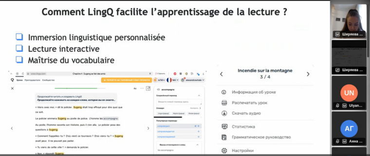 Екатерина Ширяева: этот вебинар оказался моим дебютом в мире публичных выступлений на французском языке. Верю, что роль организатора и спикера в этом мероприятии поможет мне в дальнейшем совершенствовании как французского языка, так и в выступлениях на аудиторию.
