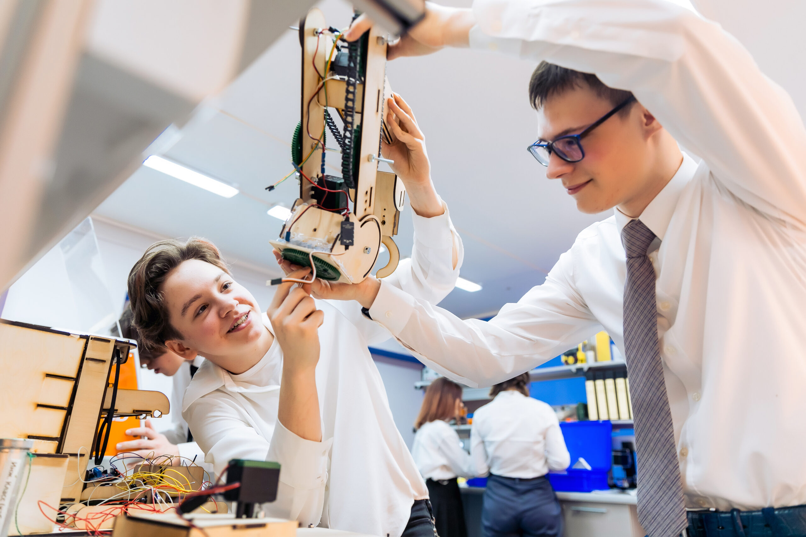Ребята работают на современном оборудовании. В текущем году основная часть обновленной аппаратуры — для изучения робототехники, от отдельно взятых роботов до целых систем. Школы, где есть авиастроительные инженерные классы, получили новые тренировочные беспилотники и комплекты для оснащения летных полигонов.