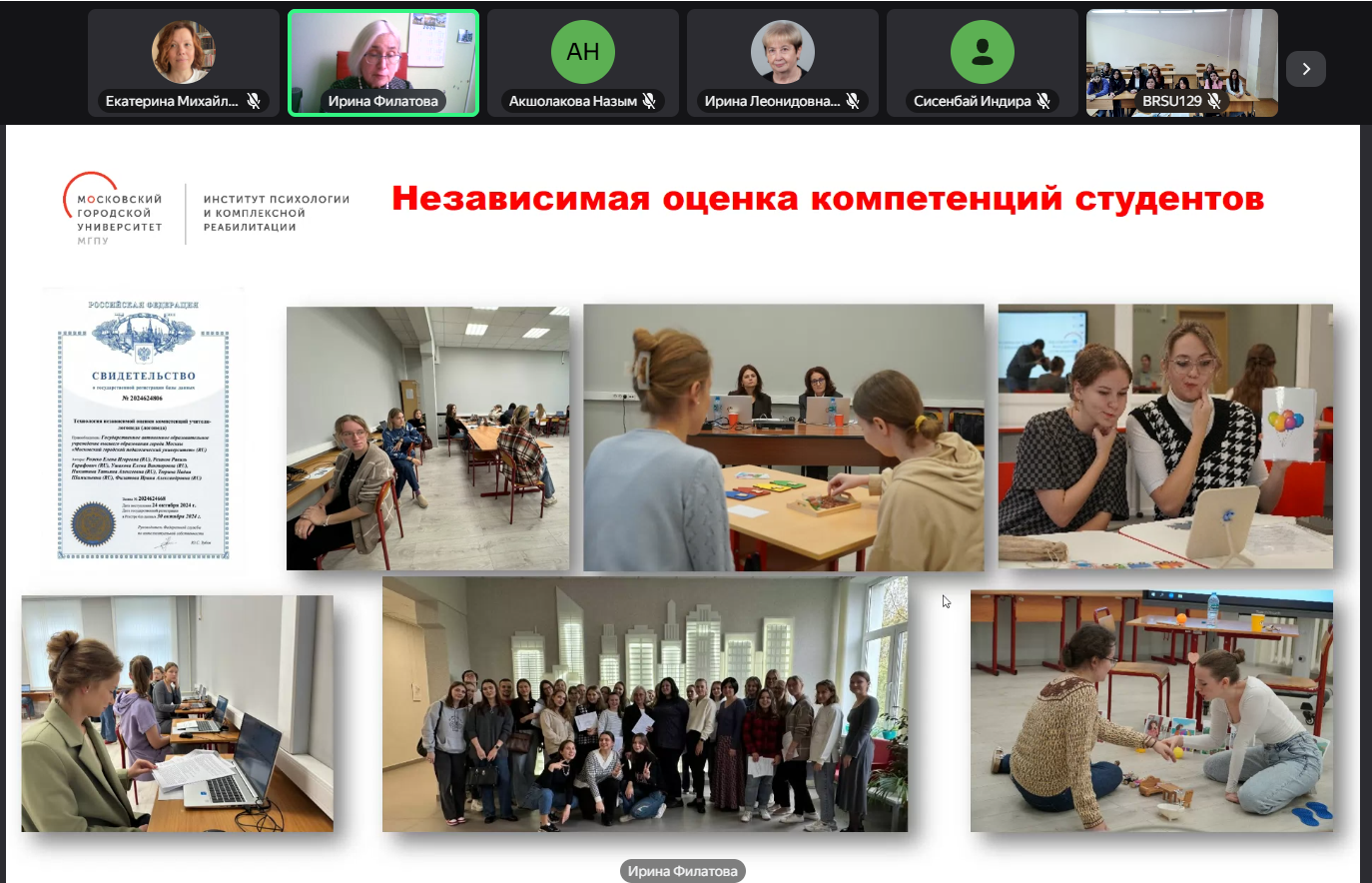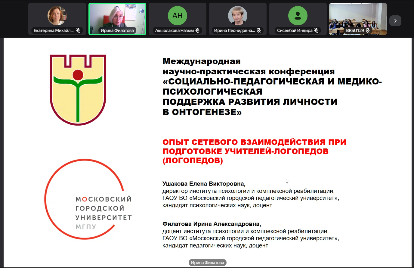 - Ушакова Елена Викторовна, директор института психологии и комплексной реабилитации, доцент, кандидат психологических наук, доцент, Филатова Ирина Александровна, доцент, кандидат педагогических наук, доцент, в докладе «Опыт сетевого взаимодействия при подготовке учителей-логопедов (логопедов)»;