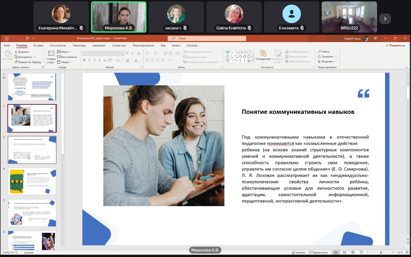 - Миронова Ангелина Валерьевна, старший преподаватель, в докладе «Формирование коммуникативных навыков как основа успешной профессиональной траектории подростков с ограниченными возможностями здоровья»