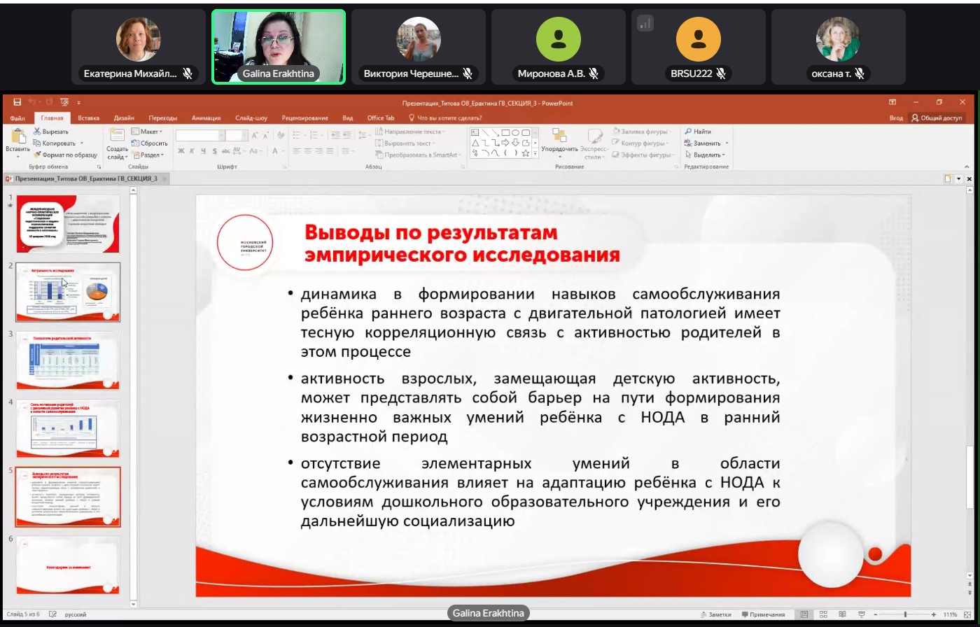 - Титова Оксана Владимировна, доцент, кандидат педагогических наук, доцент, Ерахтина Галина Викторовна, соискатель научной специальности 5.3.8 «Коррекционная психология и дефектология», педагог-психолог, в докладе «Роль родителей в формировании навыков самообслуживания у ребенка с двигательной патологией в раннем возрасте»;