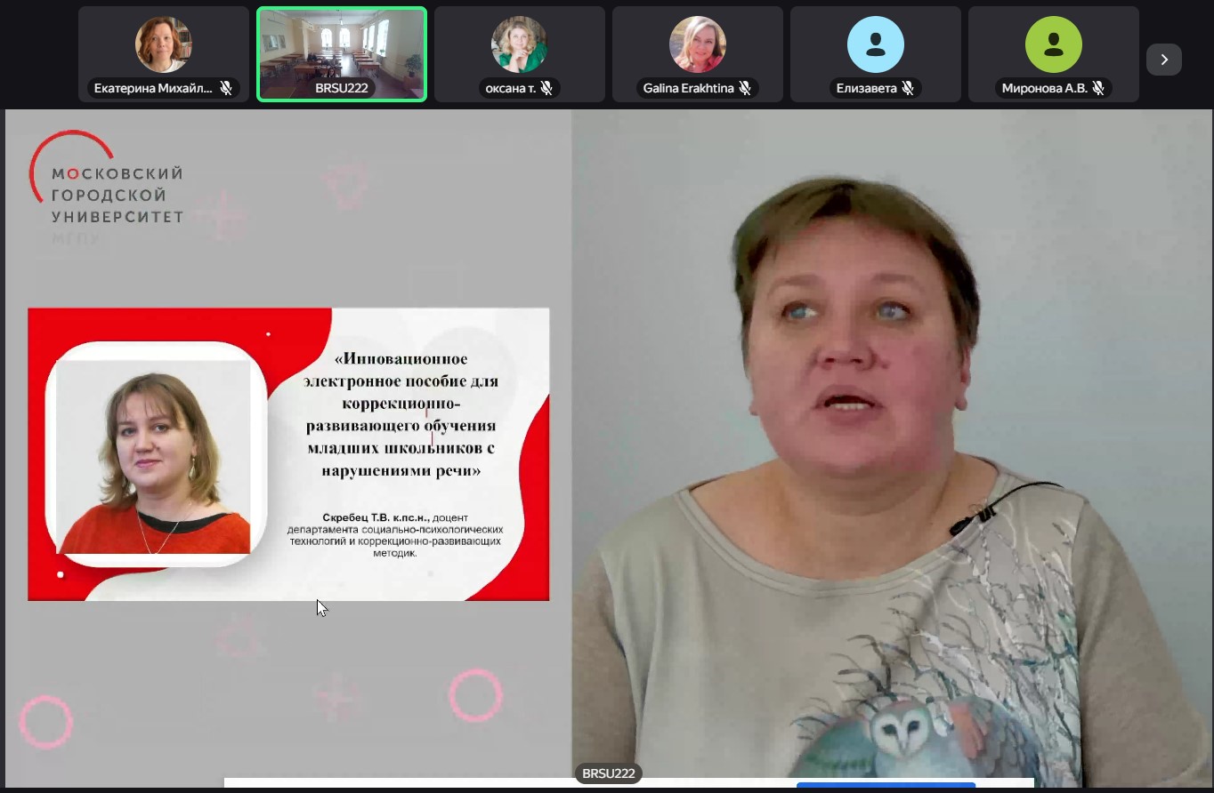 - Скребец Татьяна Викторовна, доцент, кандидат психологических наук, в докладе «Инновационное электронное пособие для коррекционно-развивающего обучения младших школьников с нарушениями речи»;