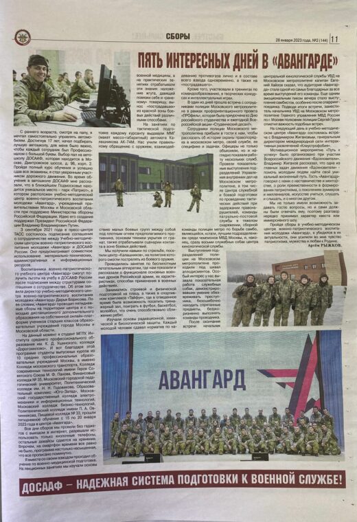 Артём Рыжков, выпускник УК «Колледж Дорогомилово» специальности «Преподавание в начальных классах» поделился своими впечатлениями о днях проведённых в Авангарде и о профессионализме вожатых и инструкторах Центра на страницах газеты «Юнармейская правда», 2,