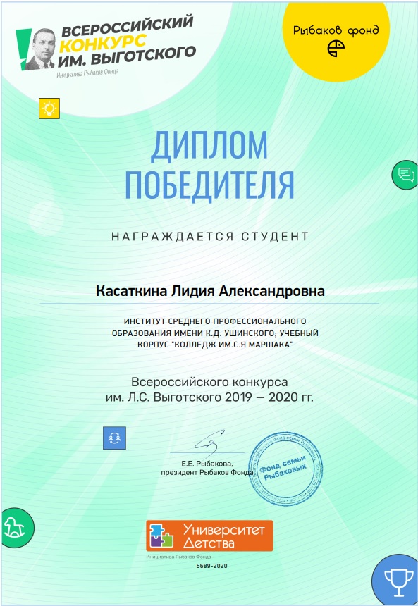 В ежегодном всероссийском конкурсе им. Л.С. Выготского приняла участие творческая студентка из ИСПО имени К. Д Ушинского, учебного корпуса «Колледж имени С. Я Маршака» Касаткина Лидия Александровна. Вместе со своим руководителем дипломного проекта Гостевой Анастасии Ивановной, Лидия приняла решение попытать свои силы, и не прогадала! Студентка вошла в число победителей! В конкурсе приняло участие более 5000 педагогов и студентов со всей России.