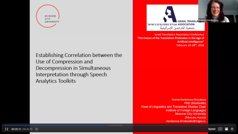 16−18 февраля 2026 года состоялась конференция «The Future of the Translation Profession in the Age of Artificial Intelligence», организатором которой выступила Израильская ассоциация переводчиков. В конференции очно и дистанционно приняли участие заместитель Директора ИИЯ Ирина Тивьяева и заведующий кафедрой языкознания и переводоведения Ксения Карданова-Бирюкова.