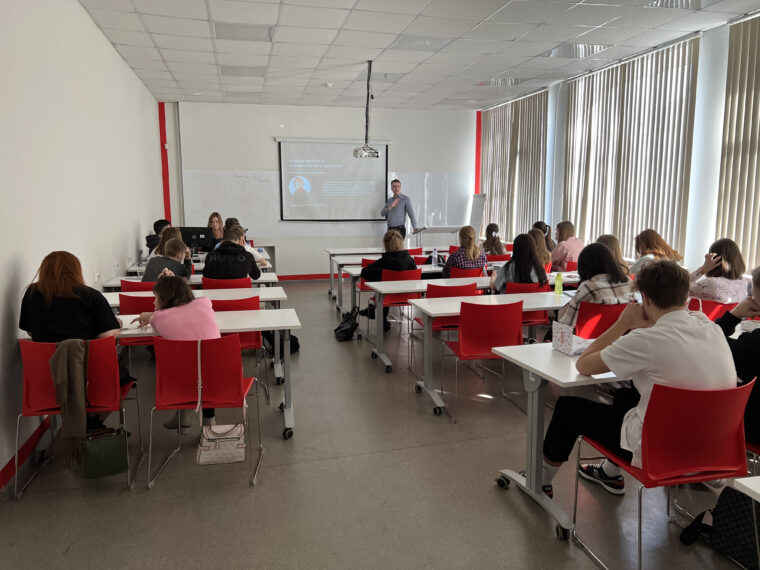 С приветственным словом к ученикам школы выступил заместитель директора института Адель Дарякин. Адель Александрович отметил важность выбора профессиональной траектории обучающегося на примере собственного карьерного пути и совместно со специалистом института Александром Осинским представил презентацию программ бакалавриата 2023 года набора.