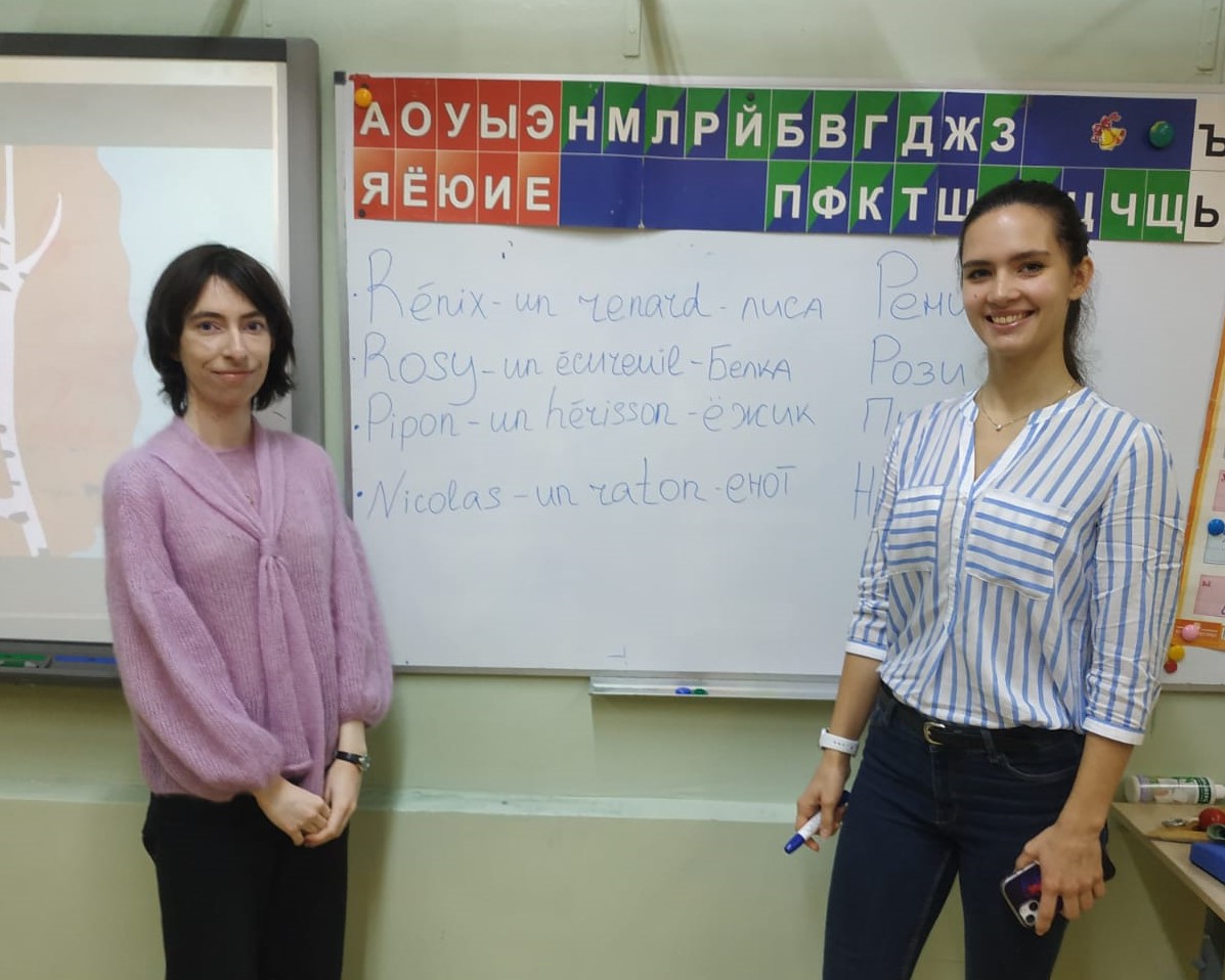 Студенты 4 курса кафедры романской филологии по направлению «Теория и практика межкультурной коммуникации (французский язык)» Офелиа Бланчет и Алёна Кузьменко проходят производственную практику под руководством доцентов кафедры романской филологии Оксаны Дубняковой и Екатерины Горбачевой в школе № 947.