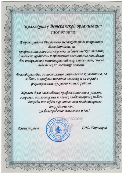 Благодарность от Главы Управы района Ростокино С.Ю Гордиковой