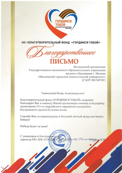 Благодарность от Фонда "Гордимся тобой"