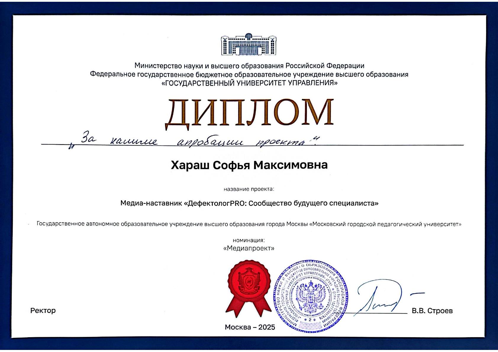 По итогам финальной защиты наш проект была удостоен диплома за наличие апробации проекта. Эта значимая награда служит подтверждением наших стараний, вложенных сил и высокой практической ценности нашей работы.