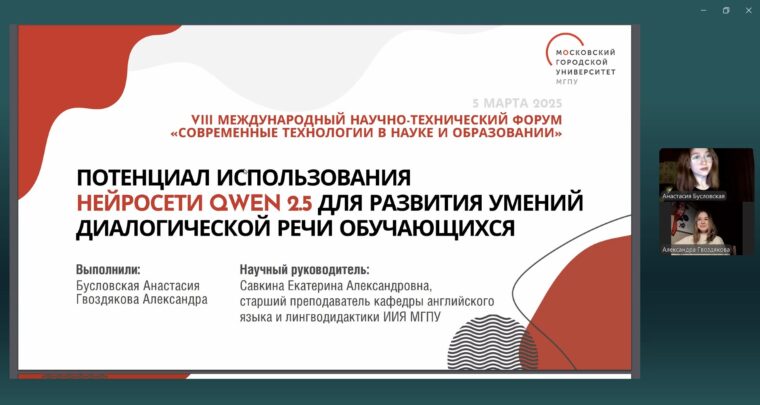 4 — 6 марта 2025 года прошел VIII Международный научно-технический Форум «СОВРЕМЕННЫЕ ТЕХНОЛОГИИ В НАУКЕ И ОБРАЗОВАНИИ». В рамках Форума состоялась работа четырех Международных конференций. Студентки ИИЯ МГПУ, Анастасия Бусловская и Александра Гвоздякова выступили на конференции «СОВРЕМЕННЫЕ ТЕХНОЛОГИИ В НАУКЕ И ОБРАЗОВАНИИ. НОВЫЕ ТЕХНОЛОГИИ И МЕТОДЫ В ВЫСШЕМ ОБРАЗОВАНИИ» с докладом на тему: «Потенциал использования нейросети Qwen 2.5 для развития умений диалогической речи обучающихся» под руководством Екатерины Савкиной, старшего преподавателя кафедры английского языка и лингводидактики. По итогам работы секции Анастасия и Александра получили диплом за лучший доклад. Поздравляем наших студенток и желаем им дальнейших побед!