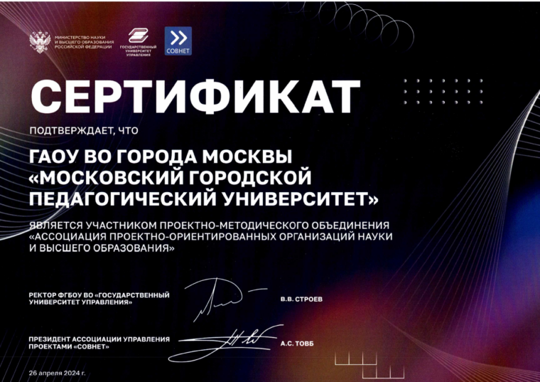 В рамках мероприятия состоялась церемония вручения сертификатов участникам Проектно-методического объединения «Ассоциация проектно-ориентированных организаций науки и высшего образования».