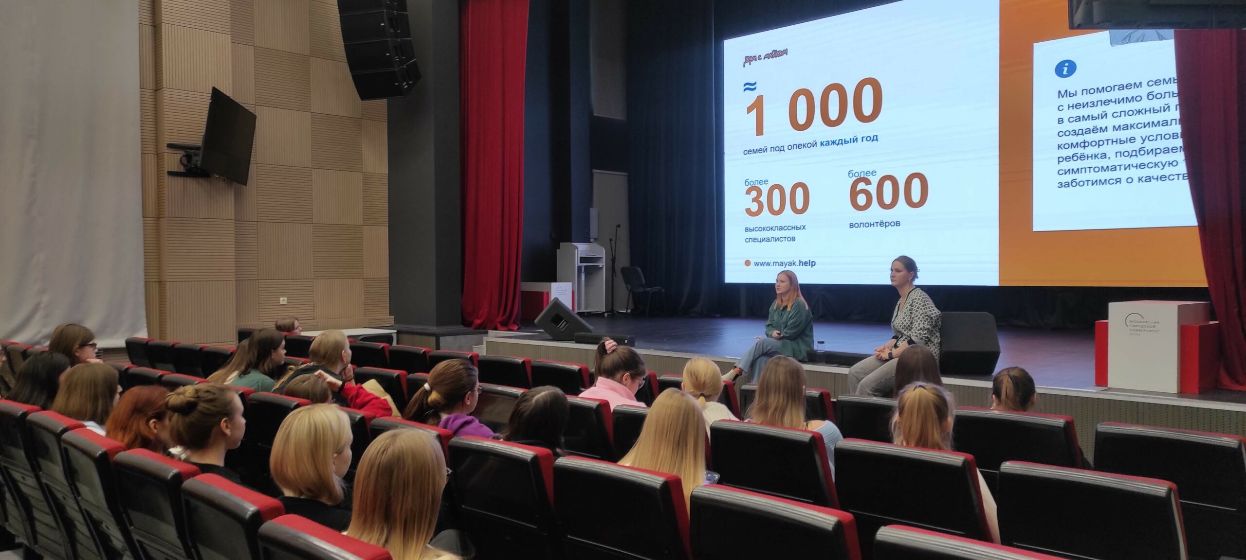 Встречу провели координаторы по работе с волонтёрами Диана Макарова и Владислава Аказина. Девушки поделились информацией об истории создания и основных направлениях работы фонда и детского хосписа «Дом с Маяком». Под опекой детского хосписа находится около 1000 семей, каждой из которых ежедневно нужна помощь и поддержка. Помощь не только медицинская, порой бытовая, порой психологическая. Сотрудники хосписа помогают семьям с неизлечимо больными детьми в самые сложные периоды жизни, создают максимально комфортные условия для ребенка, подбирают симптоматическую терапию и заботятся о качестве жизни.